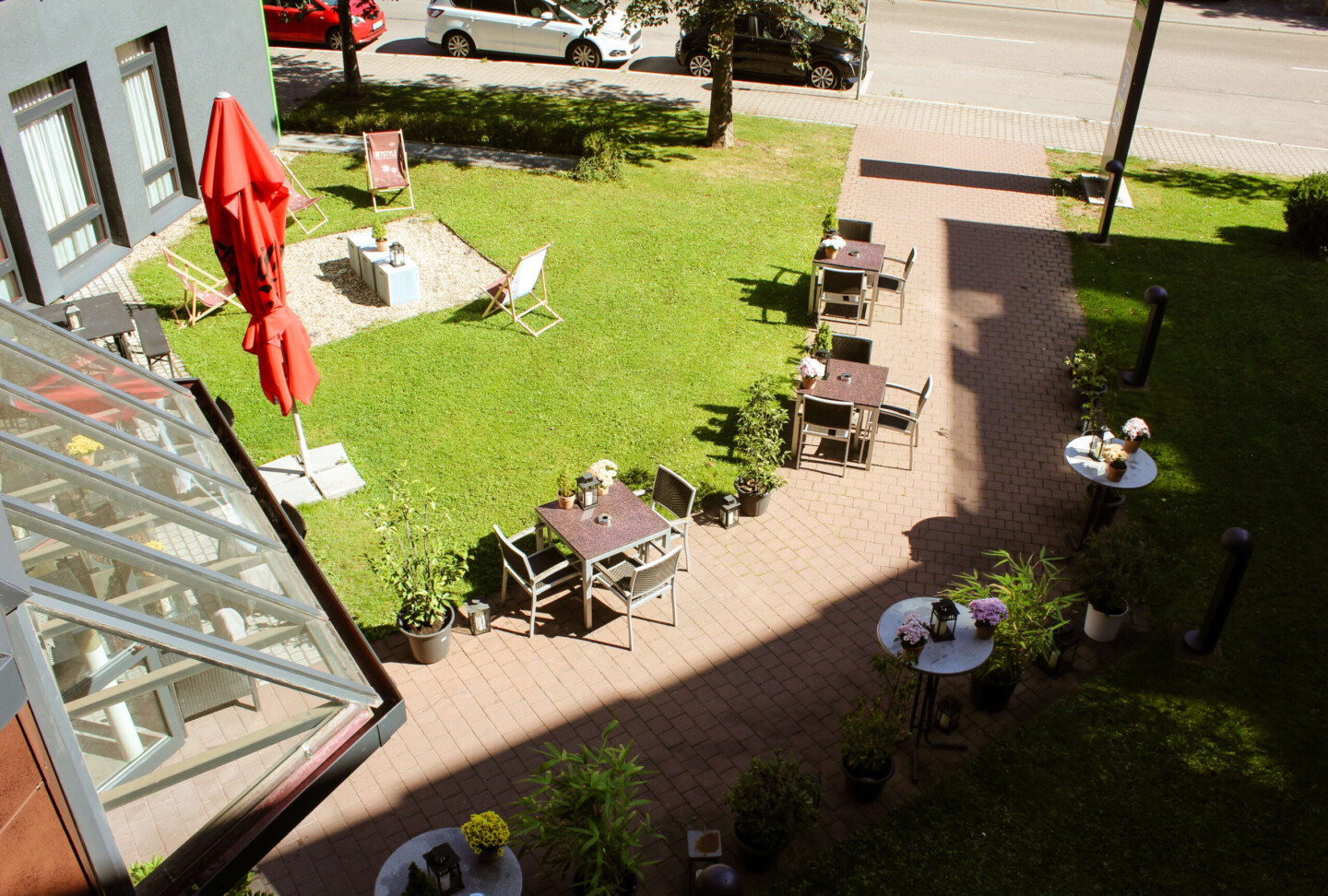 Genießen Sie den Tag oder Feierabend in unserem ansprechend gestalteten Außenbereich mit Lounge-Möbeln.